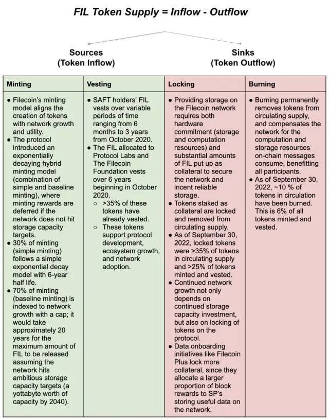 根据当前协议规范,最多将创建20亿FIL。其中,70%分配给存储和相关服务(即铸造代币以奖励存储提供商),20%(从2020年10月开始,在6年内授予)分配给Protocol Labs和Filecoin基金会,以支持网络开发、采用和生态系统增长。剩余的FIL分配给SAFT投资者,于2020年10月开始授予,期限从6个月到3年不等。20亿FIL是理论上可以铸造和授予的最大金额。然而,这可能不是最终进入网络循环供应的FIL的数量:作为w矿储备持有的3亿FIL需要进行协议升级才能被挖出,这意味着由社区决定应该释放多少数量。网络的增长需要使用和消耗代币,从而减少了可用的代币供应。截至2022年9月底,已铸造或授予约5.2亿FIL。其中,大约70%处于流通中,因为大量的FIL由于网络交易费用被烧毁(永久从流通中移除),或被锁定为质押品以确保网络安全并激励可靠的存储。随着网络的成熟,代币排放率(归属和铸造)预计会逐渐降低,因为Filecoin具有有限的归属时间表和一个排放与网络增长挂钩的铸造模型。