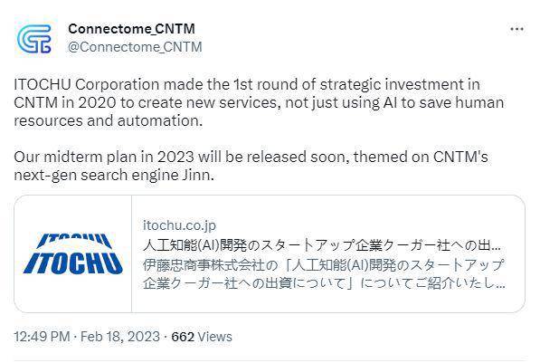 伊藤忠商事株式会社已对CNTM进行战略投资 2023年中期计划“Brand New Deal 2023”将围绕CNTM的下一代AI智能搜索引擎Jinn展开
