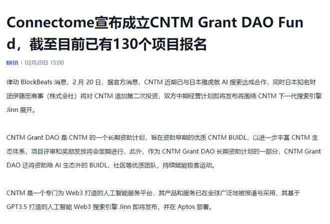 雅虎重金布局AI赛道,CNTM快速借力上位随着OpenAI的爆火,全球各大科技巨头都开始全力布局AI赛道,其中包括雅虎。在与Line合并之后,日本雅虎每年将投入超过1000亿日元用于人工智能技术的投资与开发,致力于成为全球领先的AI公司。日本雅虎与CNTM正式达成了合作,在AI智能搜索方面进行全面的业务合作,雅虎也将为CNTM提供相应的资源与资金支持,致力于共同打造全球第一的AI Web3搜索引擎。日本第一大财团伊藤忠商事在2020年对CNTM进行了第一轮战略投资,目标是创造新的服务,而不仅仅是利用AI技术节省人力和自动化业务